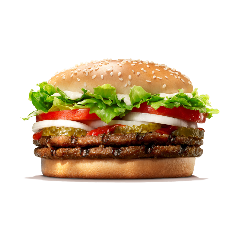 Nuestra doble WHOPPER® lleva dos tortas de 1/4 de libra de carne de res a la parrilla, preparada con jugosos tomates, lechuga fresca, mayonesa, pepinillos, cebollas en rodajas, queso amarillo americano y un pan suave con ajonjolí. ¡Pedila en combo con papas y una refrescante bebida!.