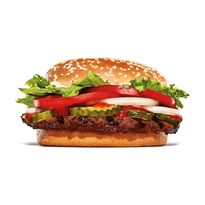 Nuestra WHOPPER® lleva una torta de 1/4 de libra de carne de res a la parrilla, preparada con jugosos tomates, lechuga fresca, mayonesa, pepinillos, cebollas en rodajas y un pan suave con ajonjolí. Pedilo en combo con papas y refresco.