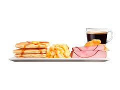 ¡Desayuno completo para reyes! Nuestros esponjosos pancakes acompañados de huevo y jamón.