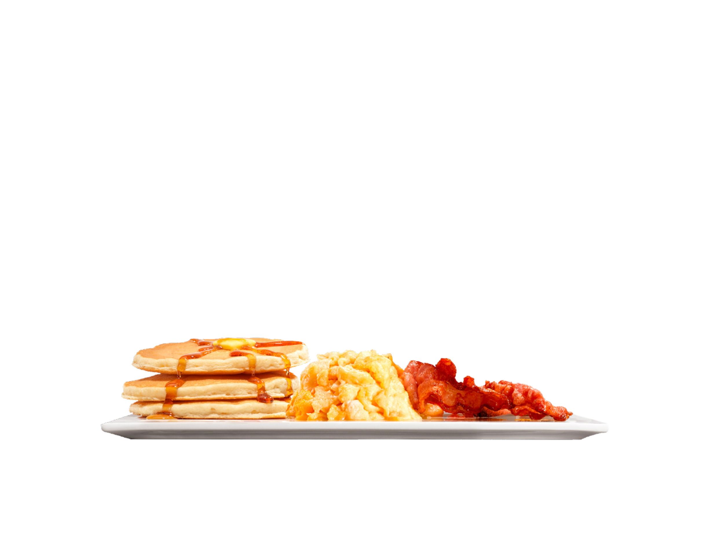 ¡Desayuno completo para reyes! Nuestros esponjosos pancakes acompañados de huevo y tocino.