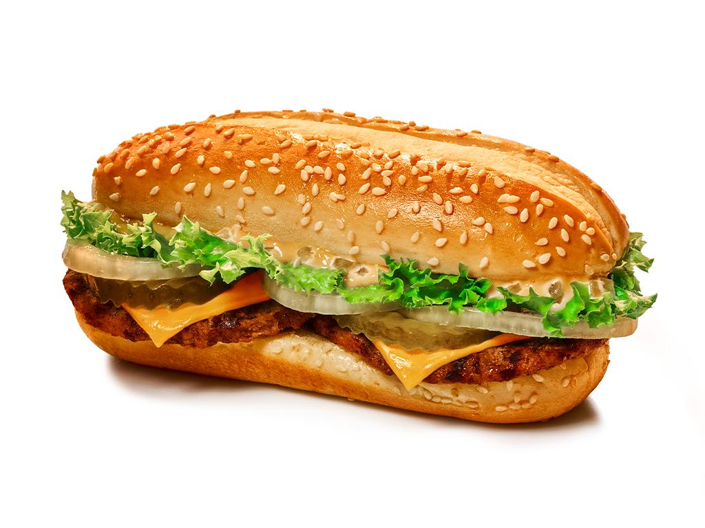 La icónica hamburguesa a la parrilla en tamaño junior, con carne jugosa, queso derretido, tomate, lechuga, cebolla, pepinillos y mayonesa en pan con ajonjolí.