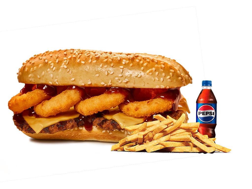 Jugosa carne a la parrilla con aros de cebolla crujientes, tocino ahumado, queso derretido y salsa BBQ, todo en un suave pan con ajonjolí.