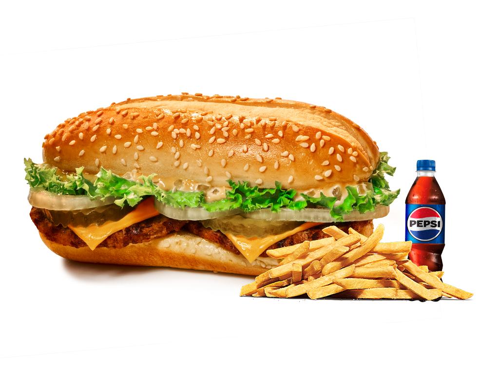 Nuestro King Veggie se prepara con una torta alargada a base de Plantas, empanizada y con un toque de especias. La lechuga fresca y una capa de cremosa mayonesa en nuestro pan con ajonjolí completan esta deliciosa combinación. Con papas y una refrescante bebida.