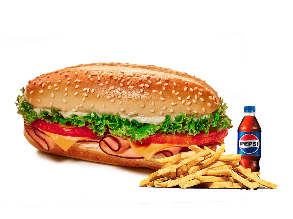 Delicioso sándwich con pan especial, 2 tortas de carne a la parrilla, queso, salsa supreme, lechuga, cebolla y pepinillos. Incluye papas y bebida.