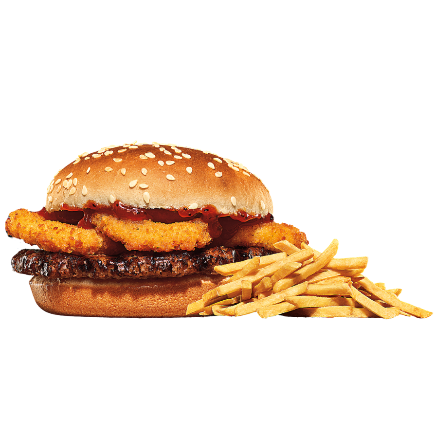 Una Hamburguesa de pollo con una torta crujiente, aros de cebolla, salsa barbacoa ligeramente ahumada y nuestro esponjoso pan con semillas de ajonjolí.