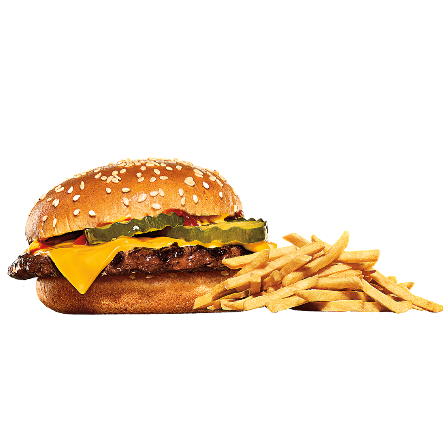 Nuestra Quesoburguesa lleva una deliciosa torta de carne a la parrilla, una rebanada de queso amarillo americano derretido, pepinillos frescos, mostaza y salsa de tomate, en un pan suave con ajonjolí.