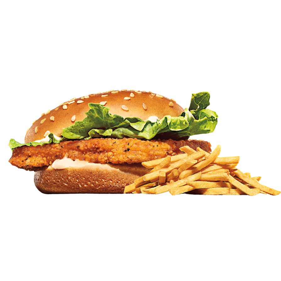 Una Hamburguesa de pollo con una torta crujiente, lechuga fresca recién cortada y nuestro esponjoso pan con semillas de ajonjolí.