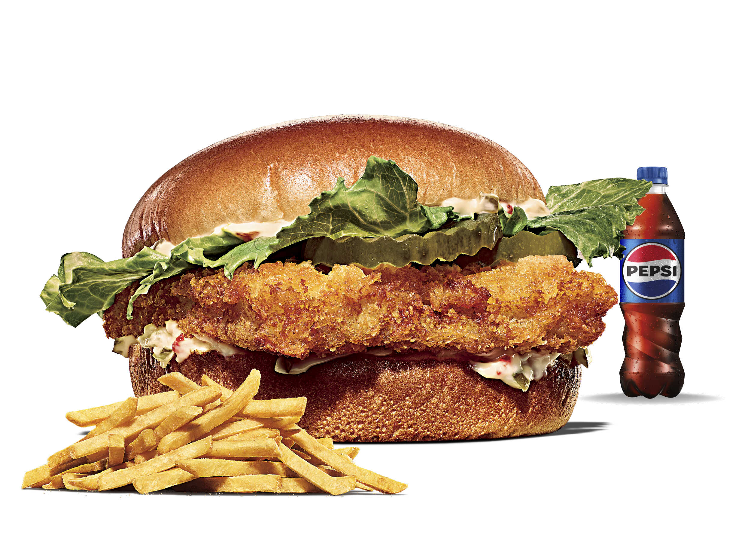Nuestro King de Pollo® se prepara con una torta alargada, empanizada y con un toque de especias. La lechuga fresca y una capa de cremosa mayonesa en nuestro pan con ajonjolí completan esta deliciosa combinación. Con papas y una refrescante bebida.