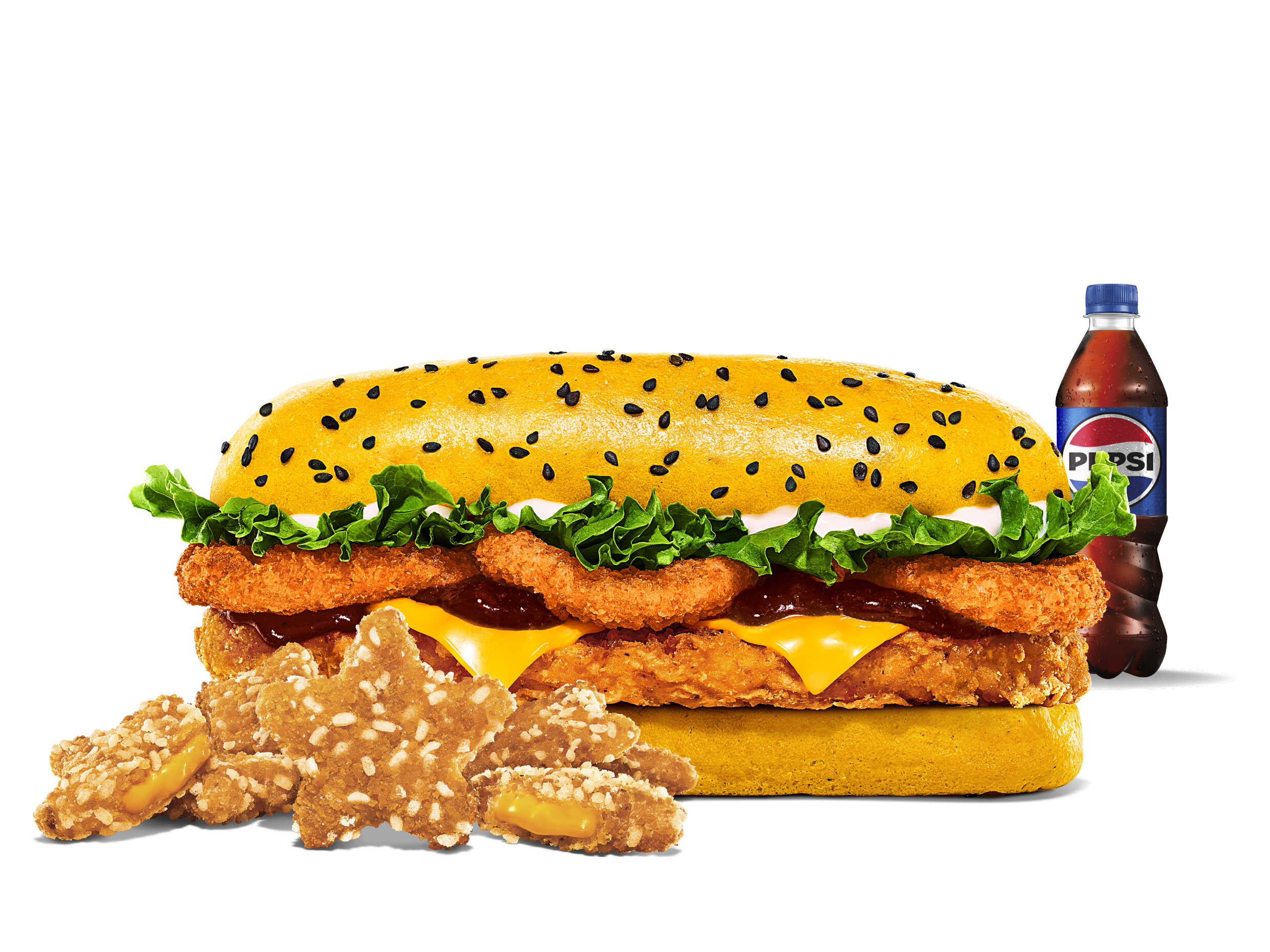 Nuestro increíble Chicken Sádwich pero ahora con aros de cebolla y salsa BBQ + Papas Medianas y Refresco.