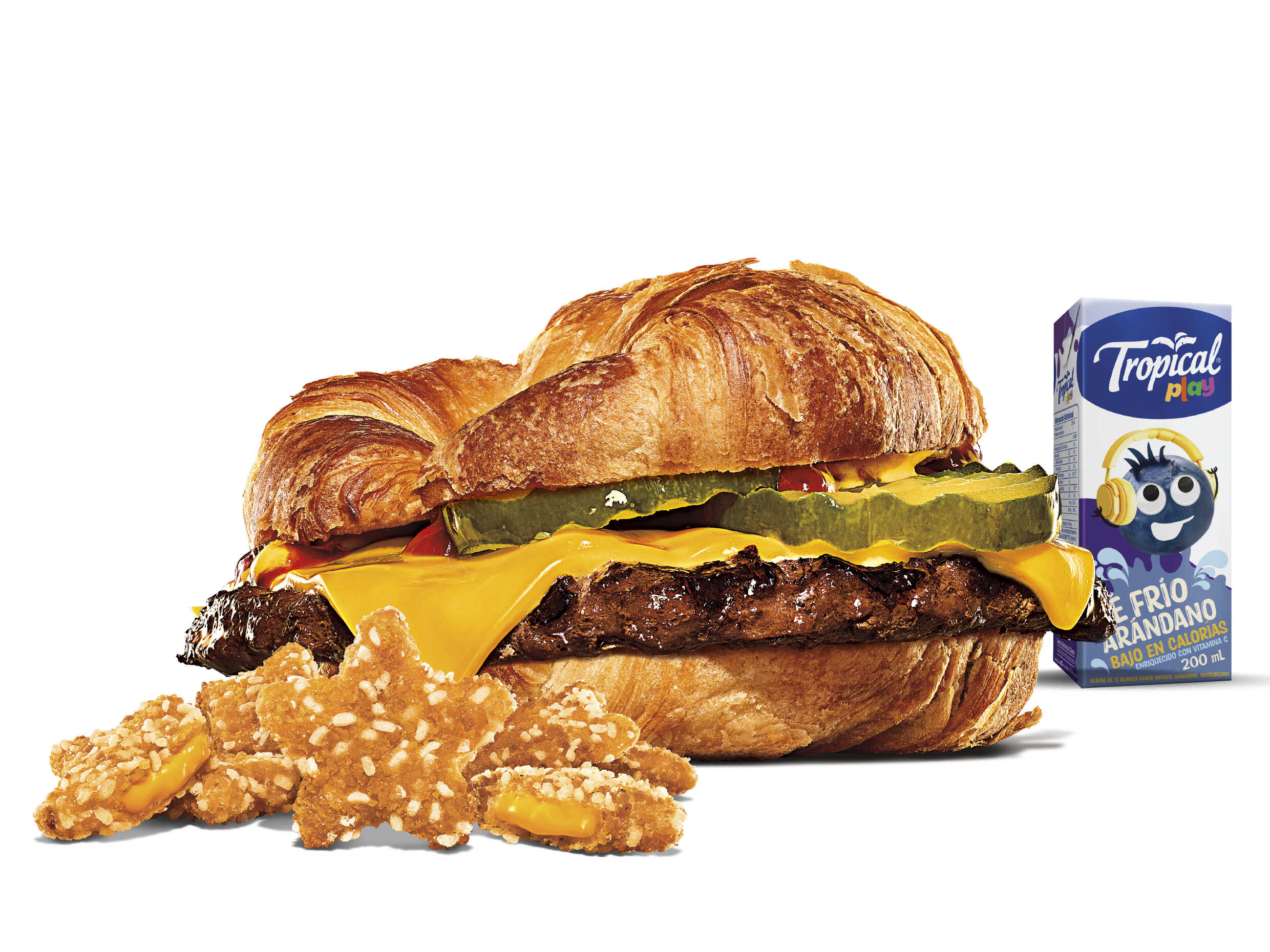 Nuestra WHOPPER® Jr. con Queso lleva una torta de carne de res a la parrilla, preparada con jugosos tomates, lechuga fresca, mayonesa, pepinillos, cebollas en rodajas, queso amarillo americano y un pan suave con ajonjolí. Con papas y una refrescante bebida.