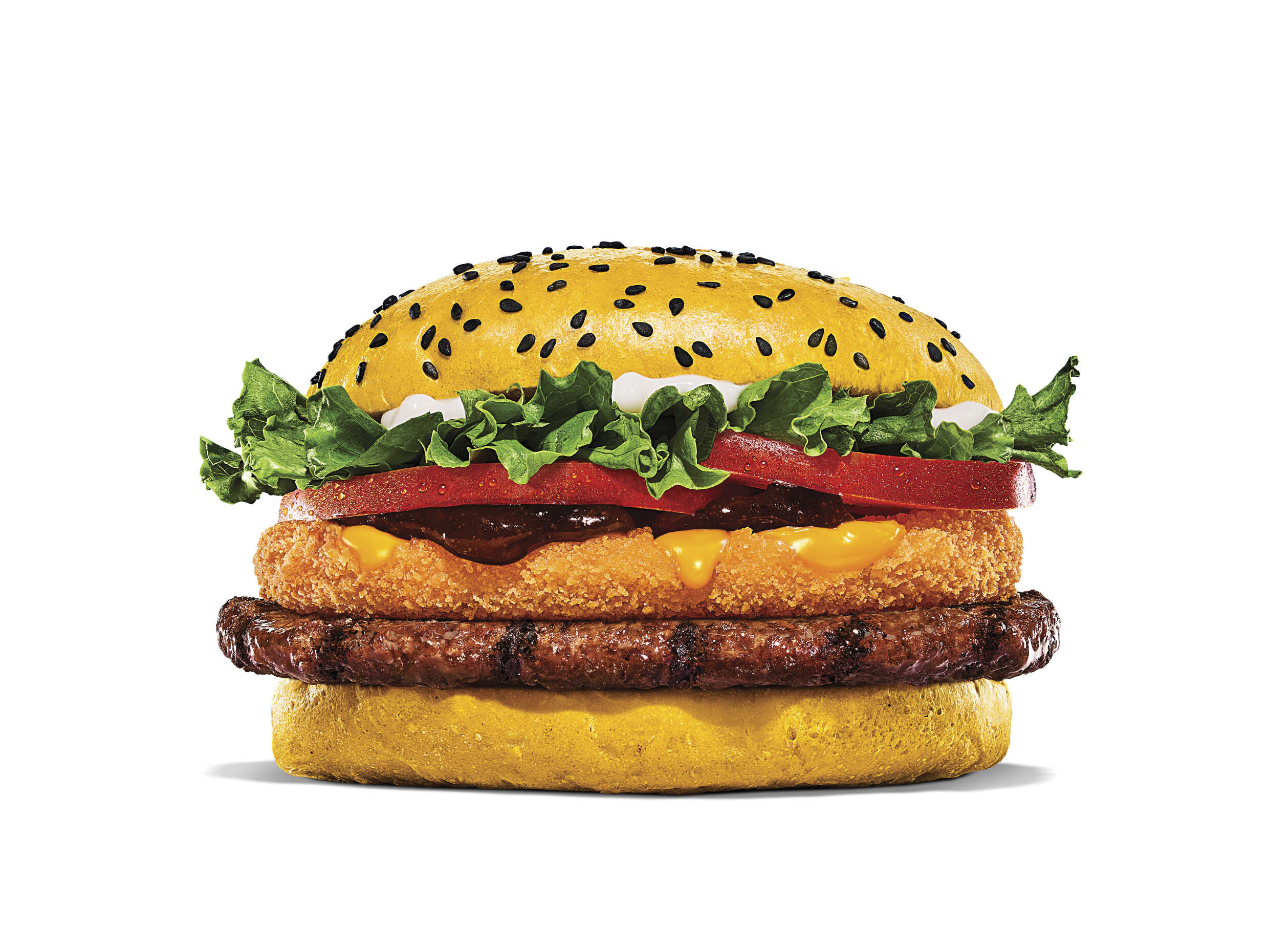 Jugosa carne a la parrilla con aros de cebolla crujientes, tocino ahumado, queso derretido y salsa BBQ, todo en un suave pan con ajonjolí.