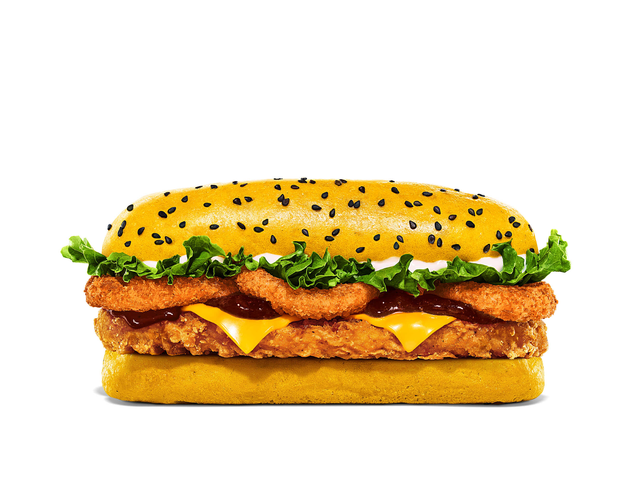 Una Hamburguesa de pollo con una torta crujiente, aros de cebolla, salsa barbacoa ligeramente ahumada y nuestro esponjoso pan con semillas de ajonjolí.
