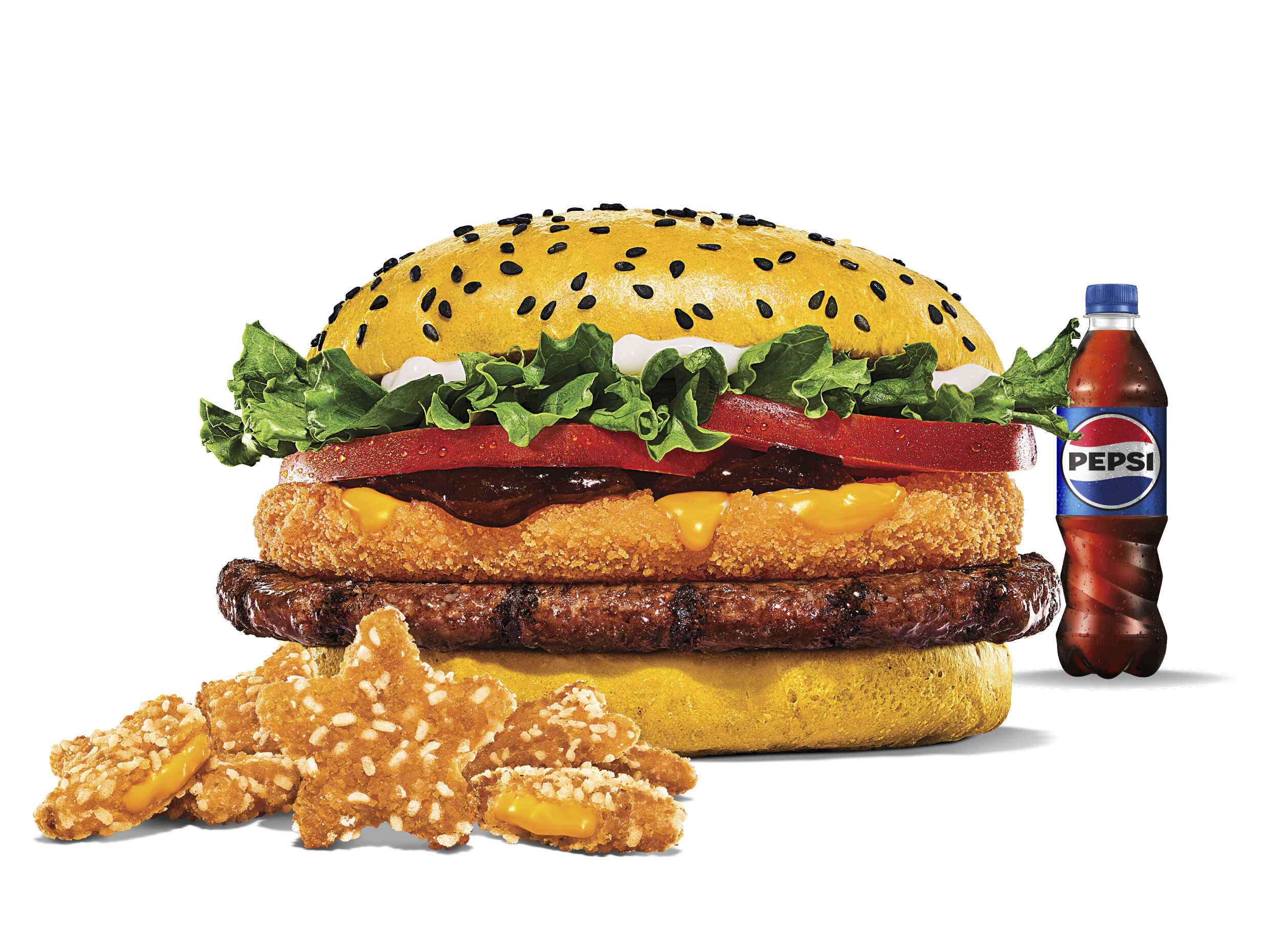Nuestra BIG KING® lleva dos exquisitas tortas de carne a la parrilla, una rebanada de queso amarillo, lechuga fresca, cebolla crujiente, pepinillos y salsa especial, con tres rebanadas de pan suave con ajonjolí. Con papas y una refrescante bebida.
