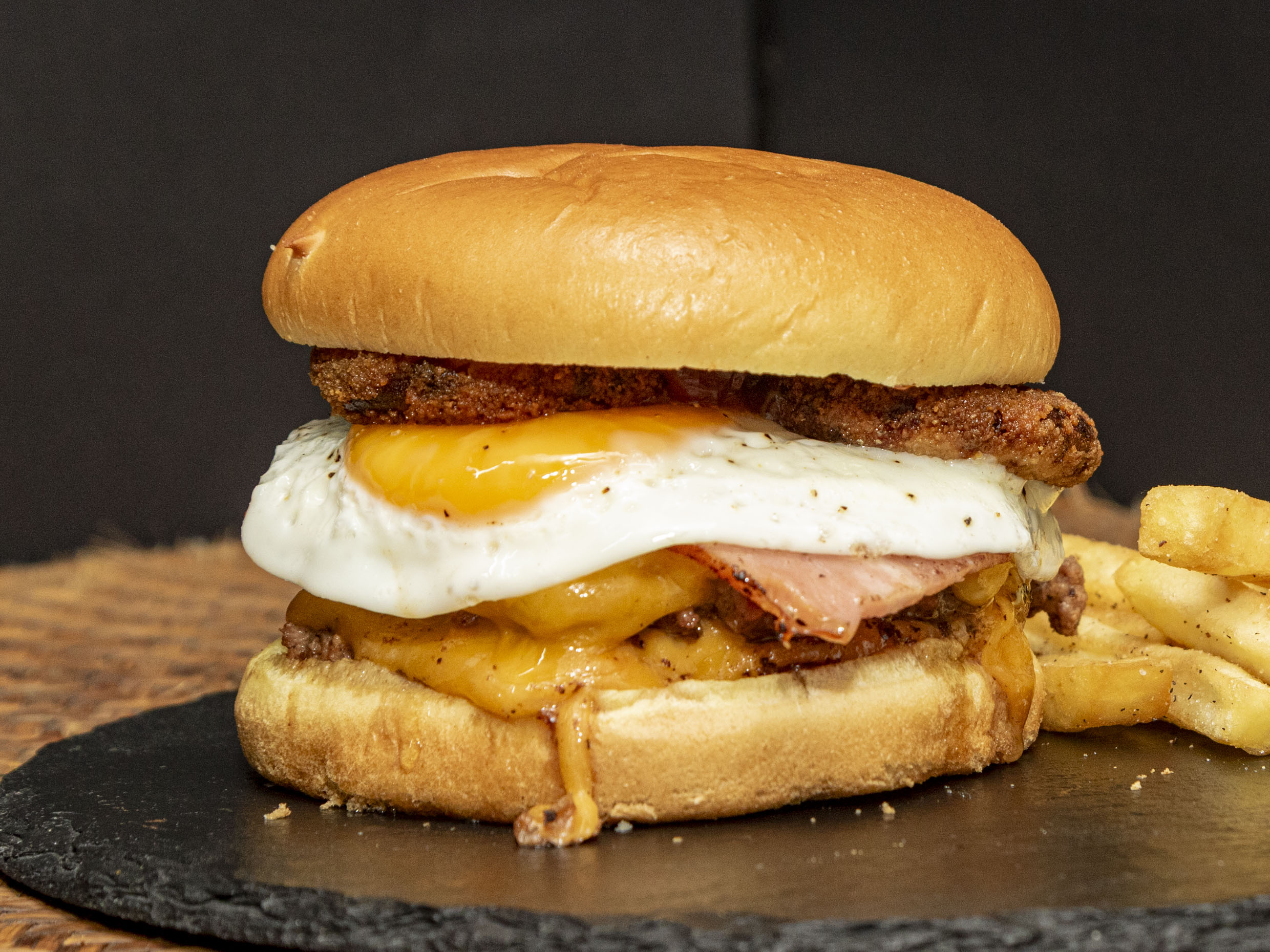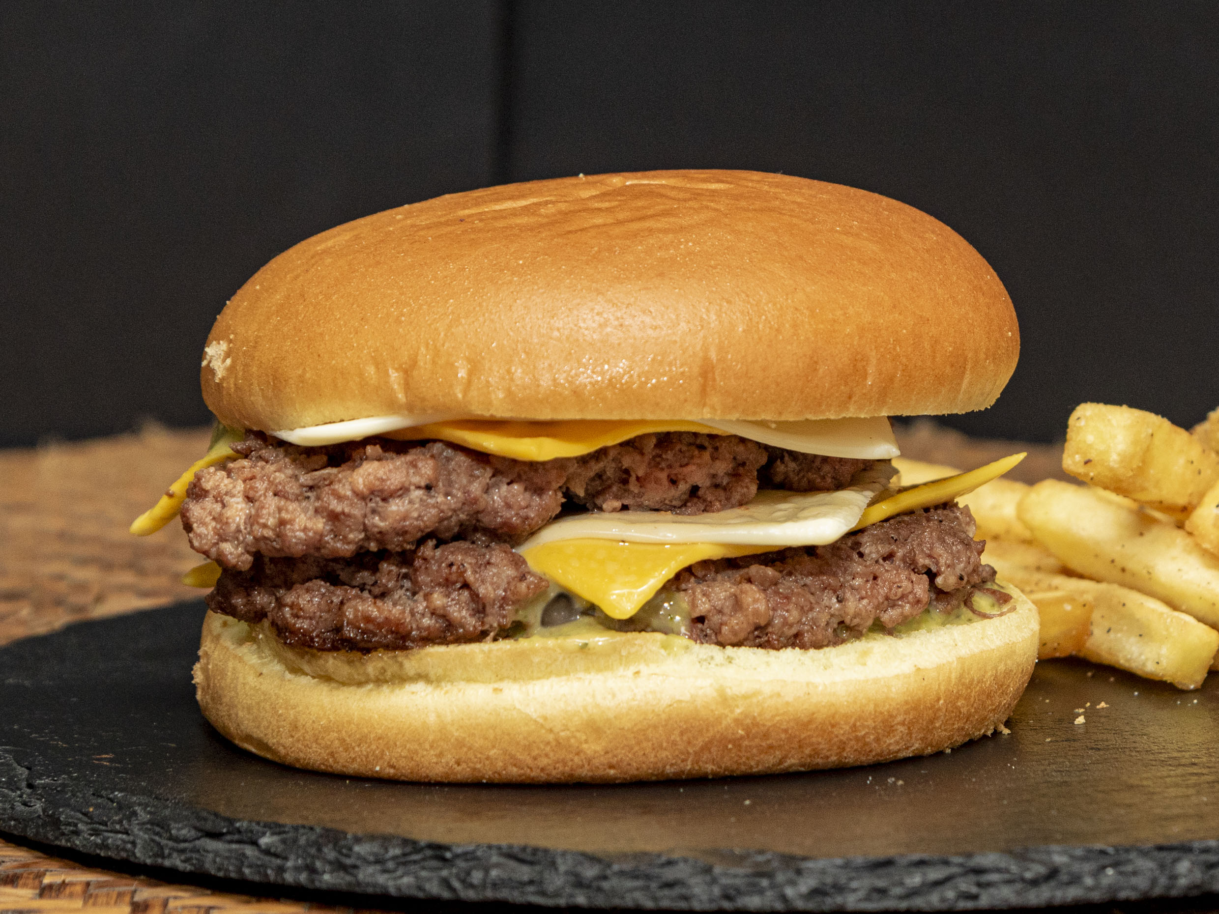 Pan brioche, doble carne de res artesanal, quedo cheddar, tocino frito, huevo frito, aros de cebolla y salsa BBQ especial de la casa.