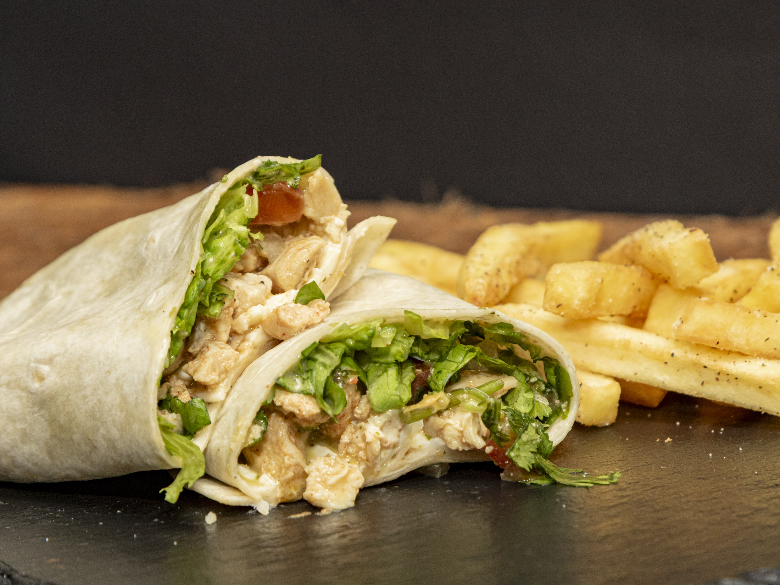 Tortilla, filet de pollo rebanado, lechuga, tomate, queso mozzarella, pico de gallo y orden de papas.