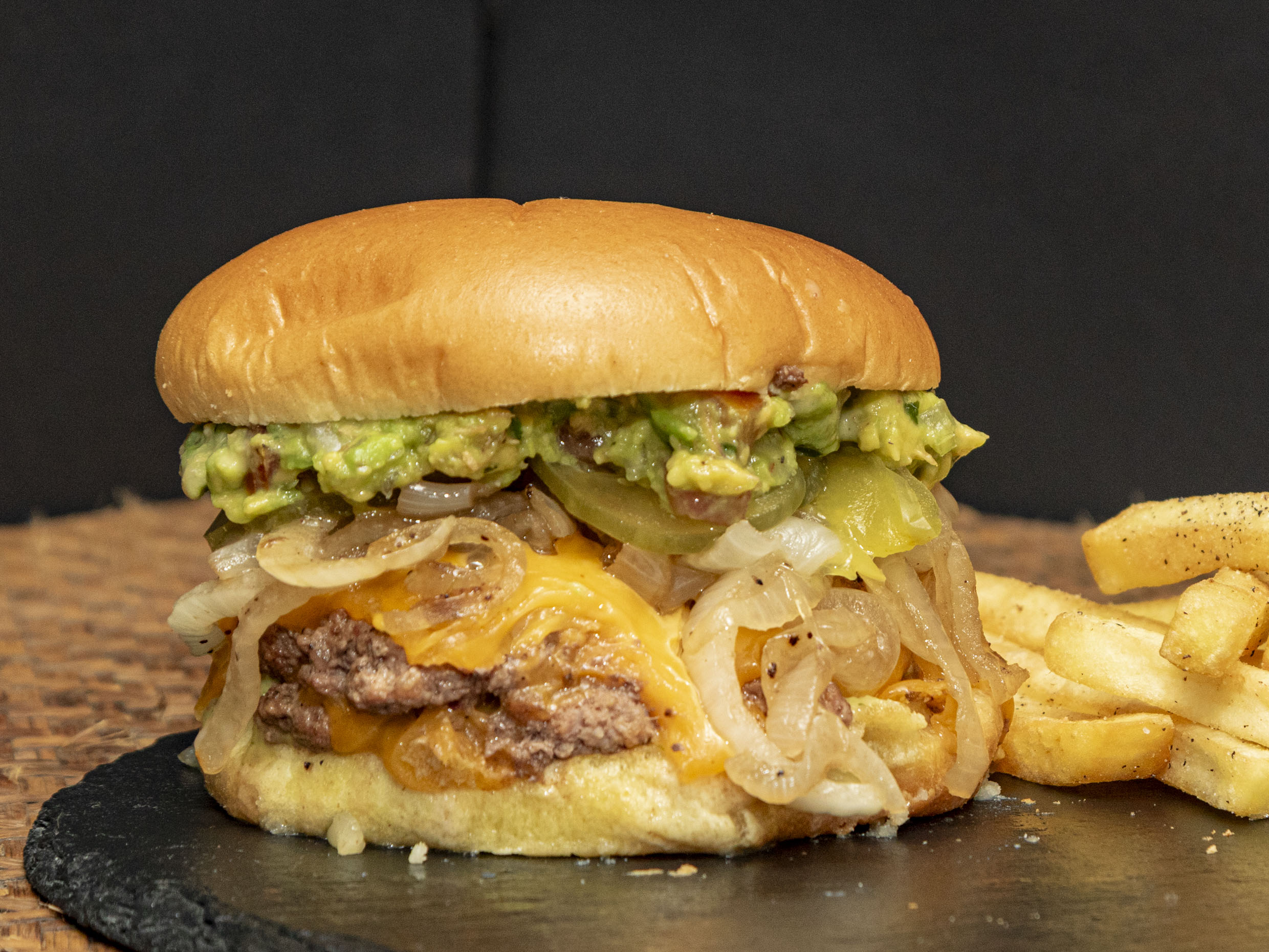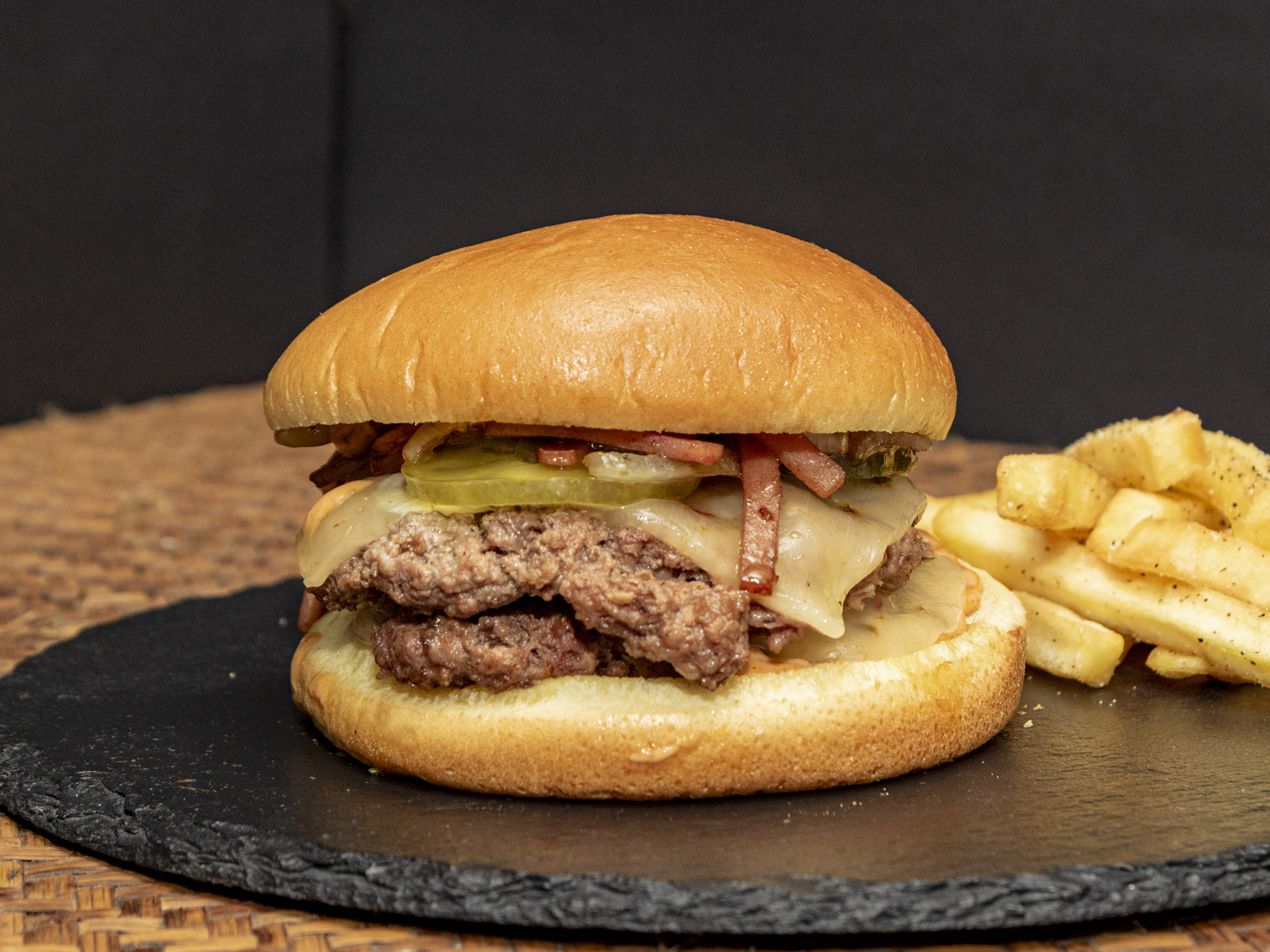 Pan tradicional, doble carne artesanal, queso cheddar, queso pepperjack, cebolla fusión caramelizada, tocino frito y salsa especial de la casa.