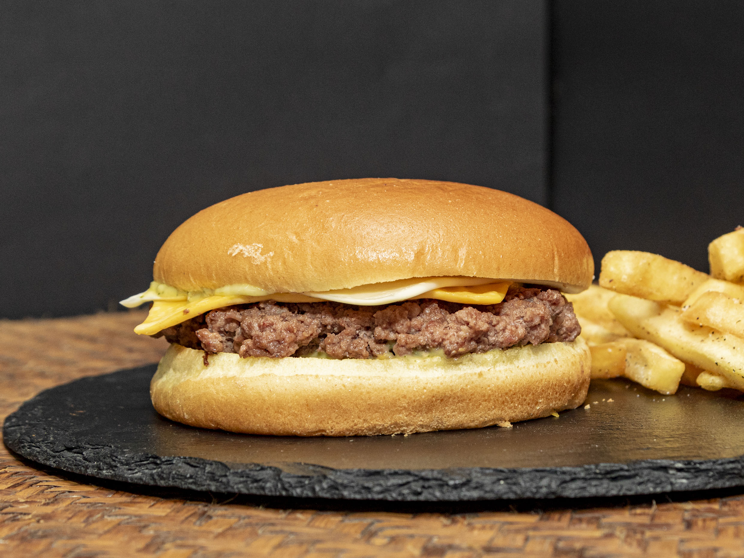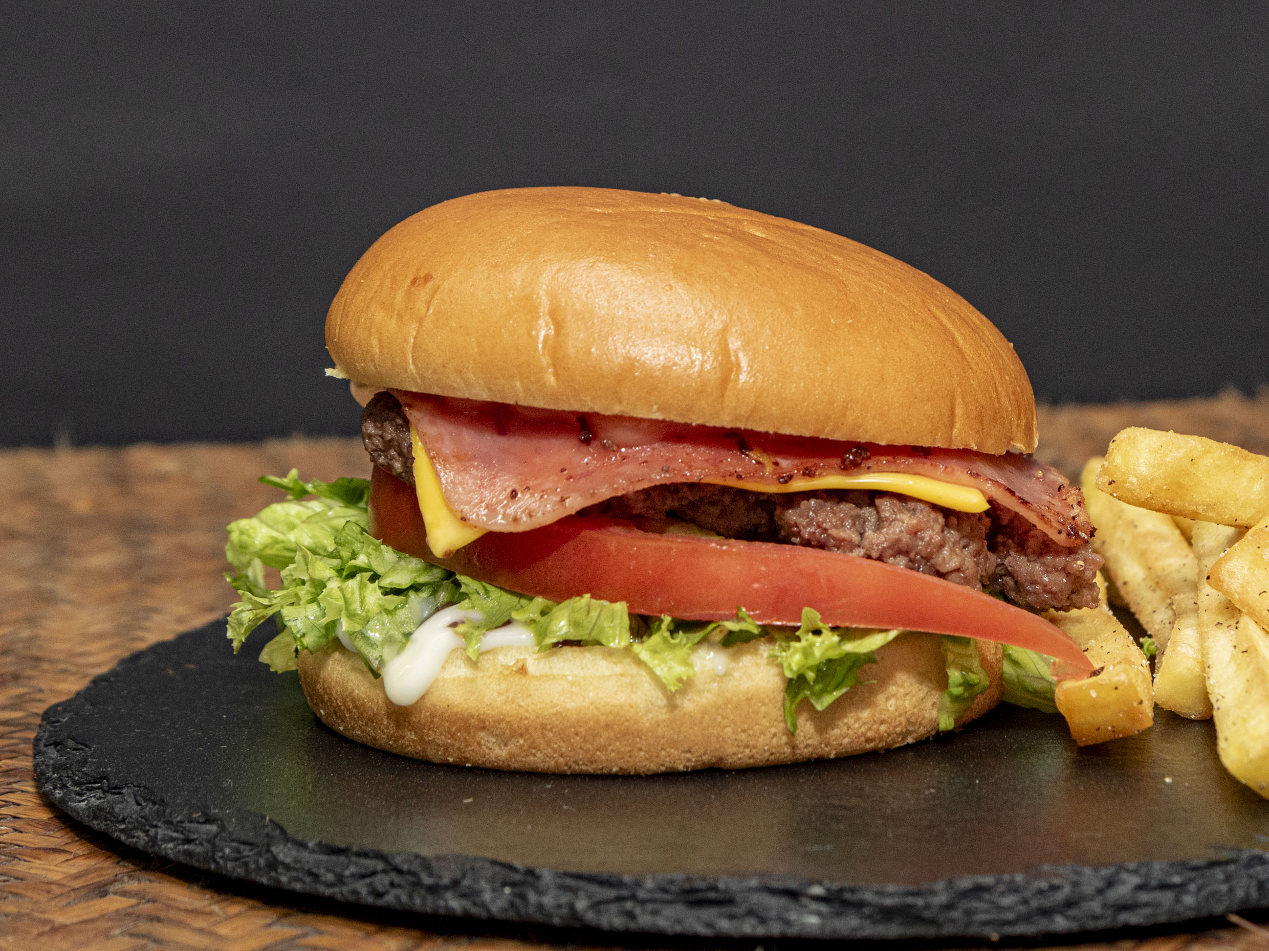 Pan brioche, carne artesanal, queso americano, jamón, lechuga y tomate y salsa rosada especial de la casa.