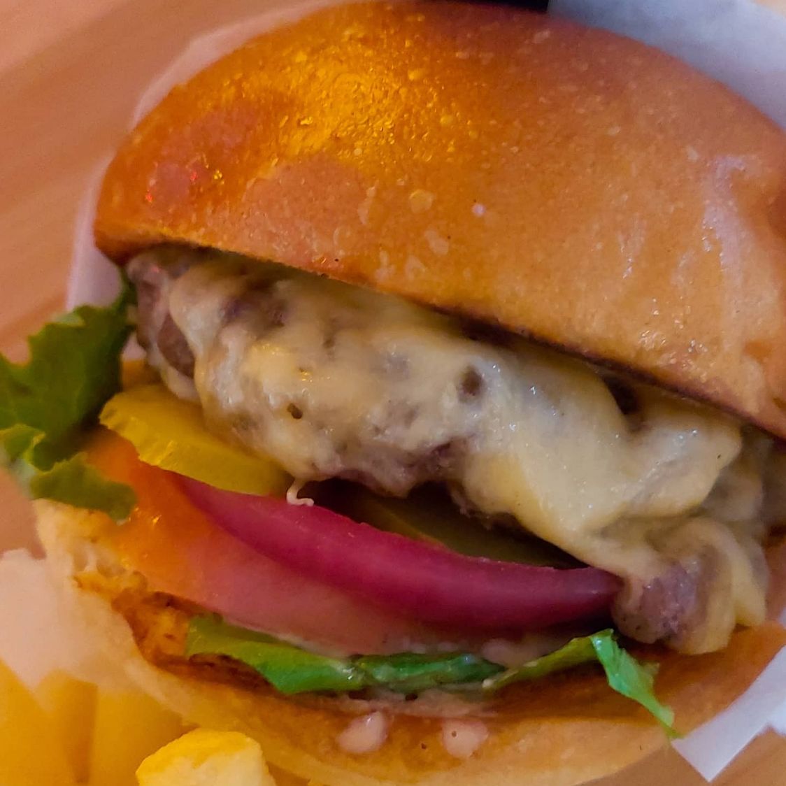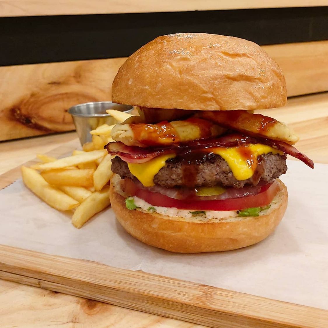 Pan brioche, carne Angus, doble americano, cebolla caramelizada, BBQ Mustard y jalapeños
