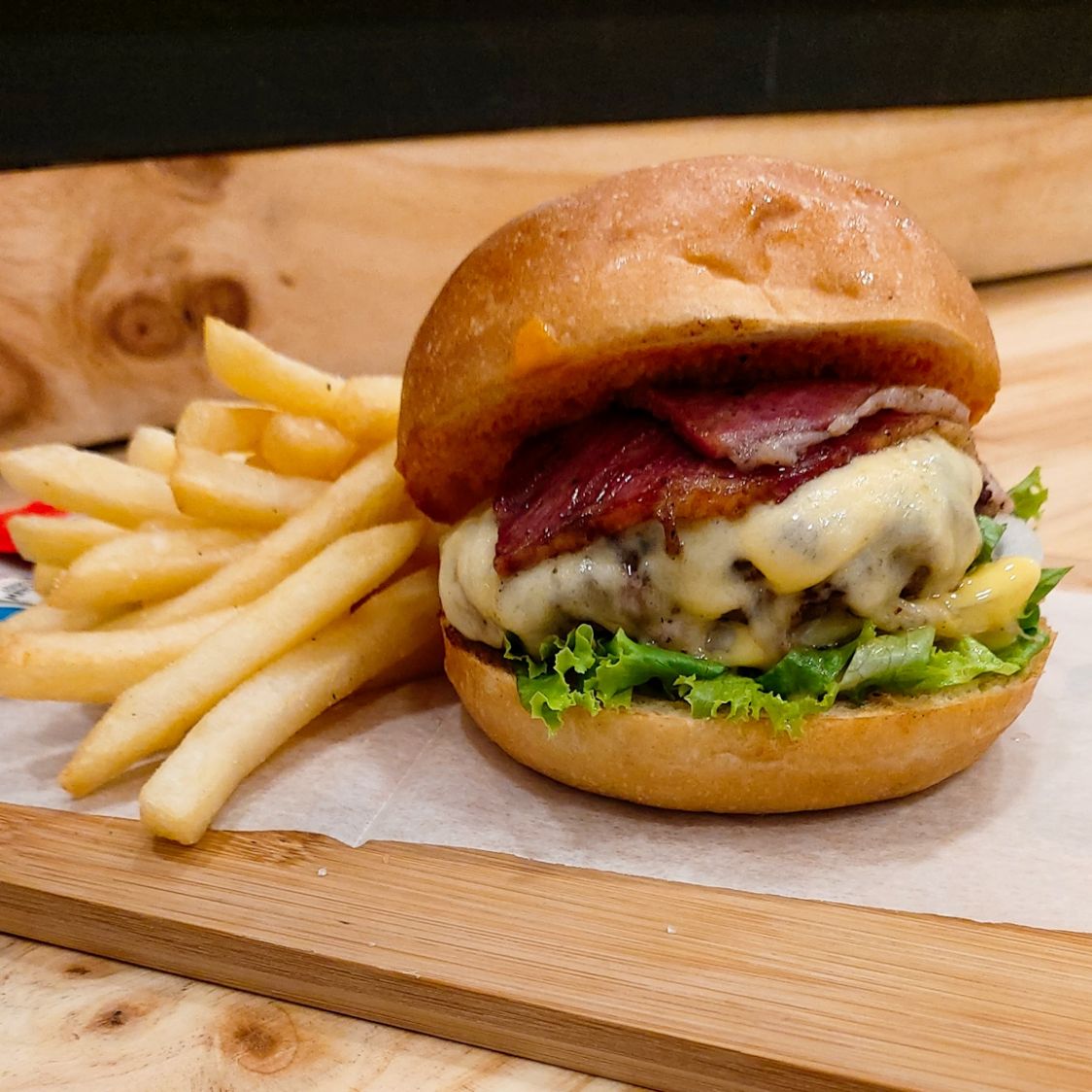 180 gr. de carne Angus, aros de cebolla, tocineta, queso americano y salsa BBQ.