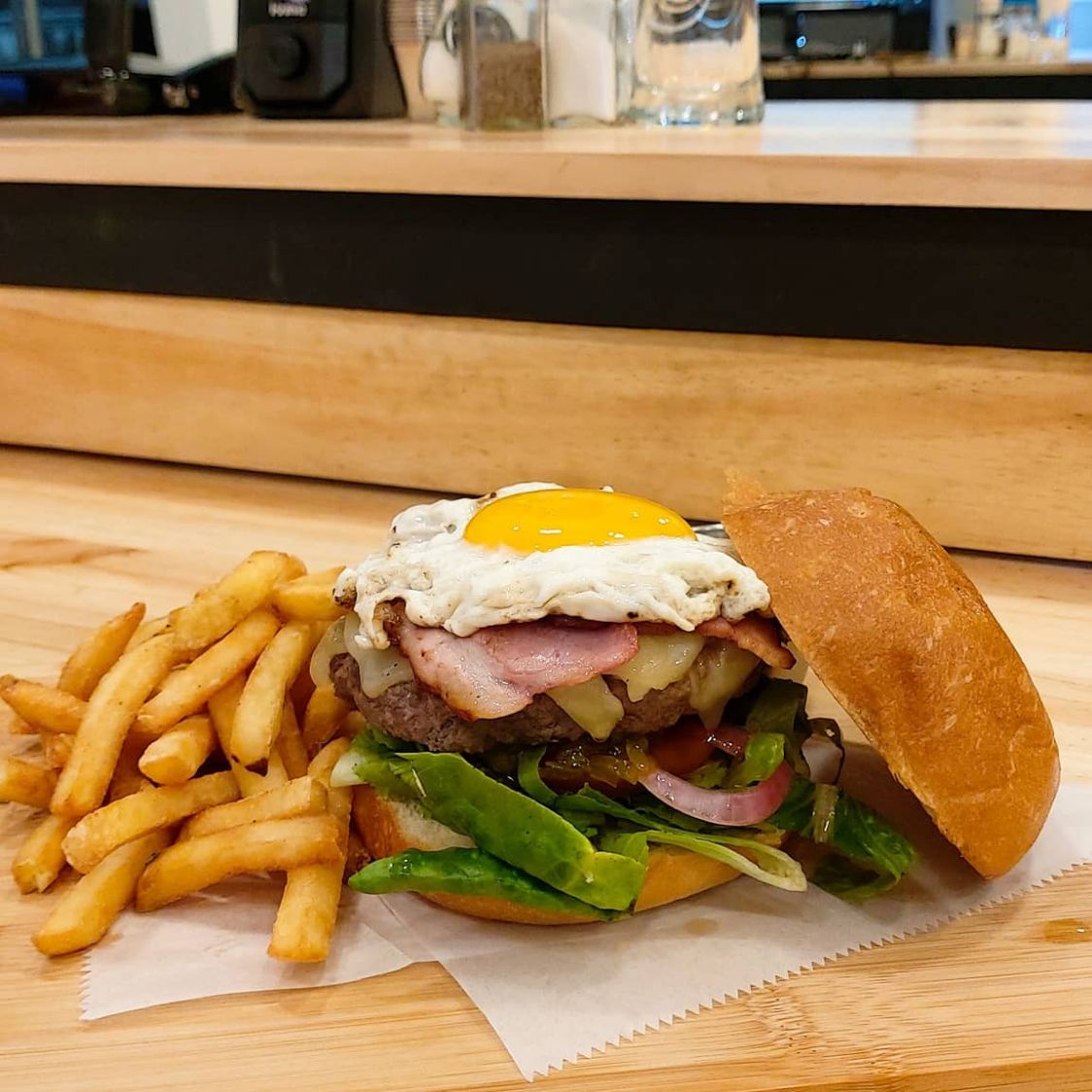 180 gr. de carne Angus, queso mozzarella, tocineta, huevo frito y chimichurri.