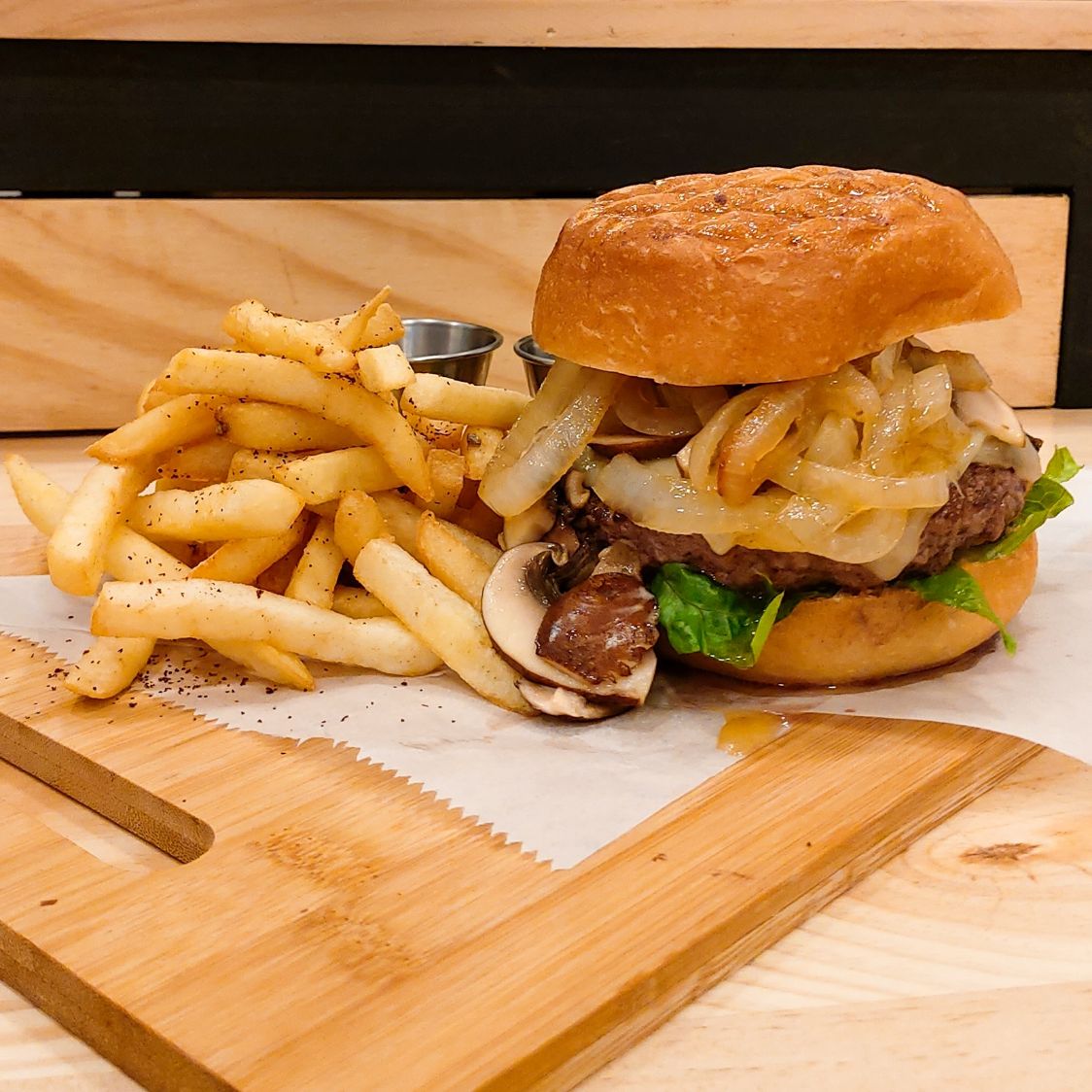 180 gr. de carne Angus, queso suizo, hongos salteados y cebolla caramelizada.