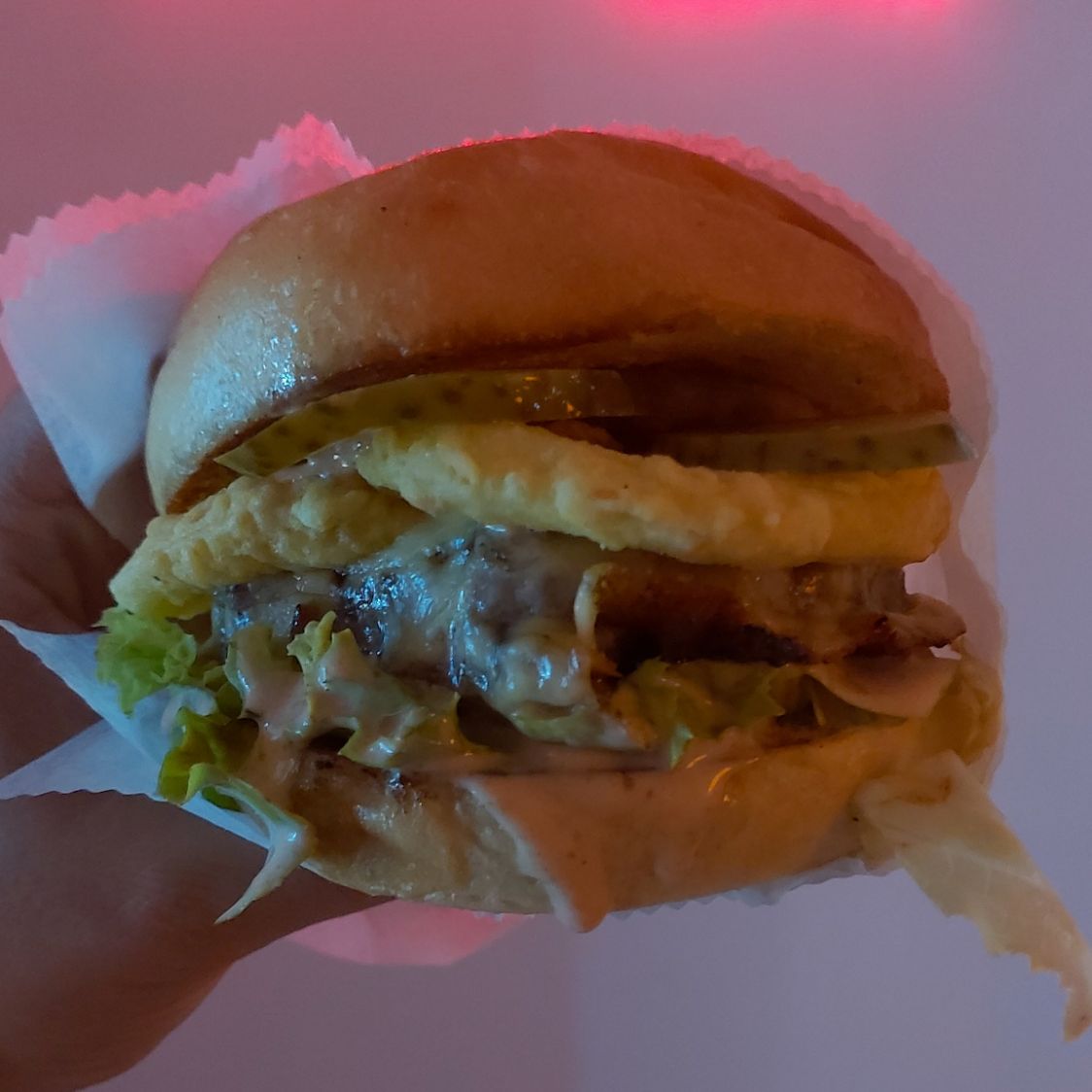 Pan brioche, Carne angus, cebolla, mostaza miel, tocineta, mozzarella, salsa spicy secreta de la casa.