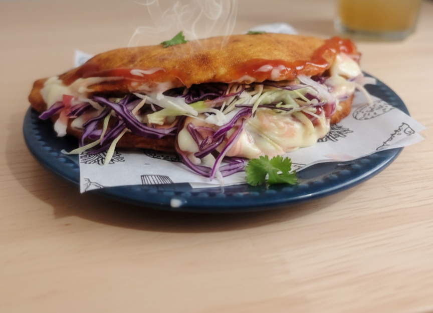 Pan artesanal color blanco con queso amarillo, torta, salsa de tomate, pepinillos y cebollita fina picada.