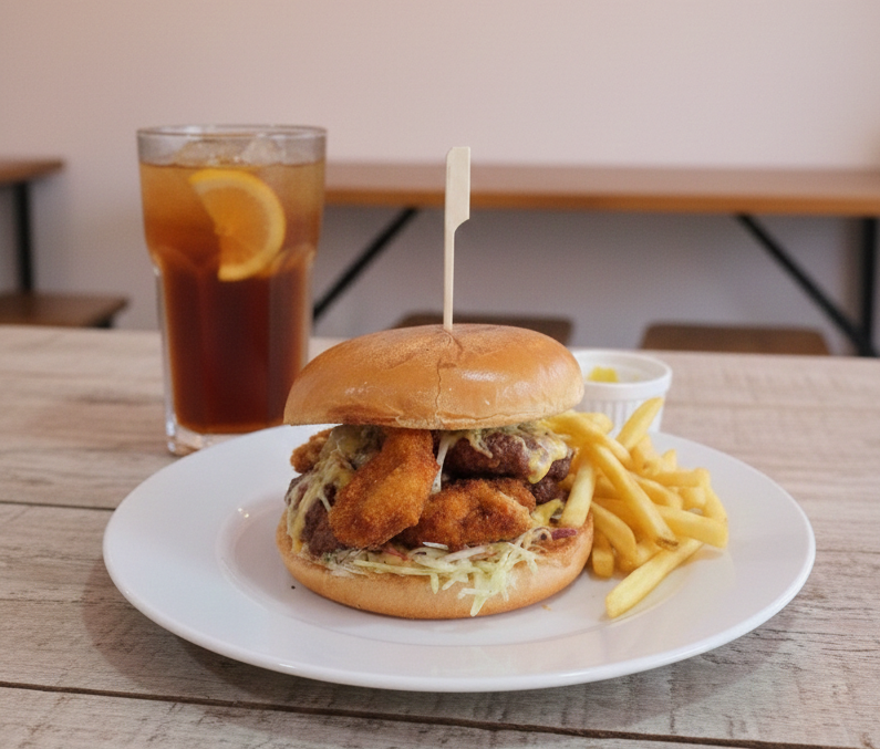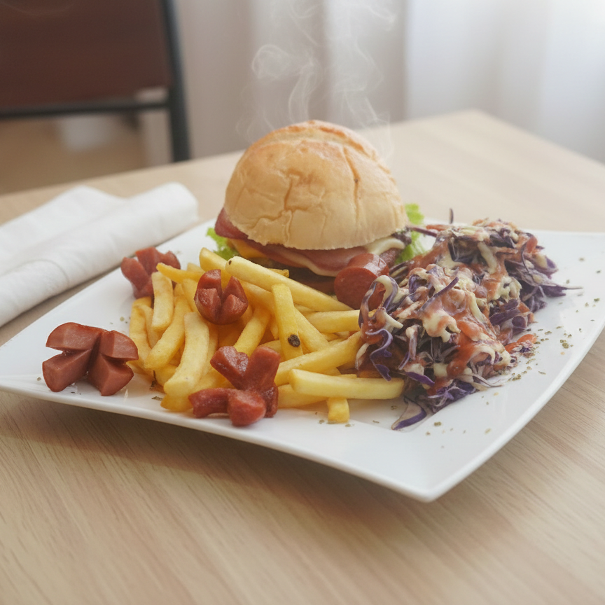 Incluye: 1 hamburguesa con jamón y queso, torta artesanal, 1 quesadilla de carne con frijoles molidos y queso, 1 papas fritas y 1 refersco natural