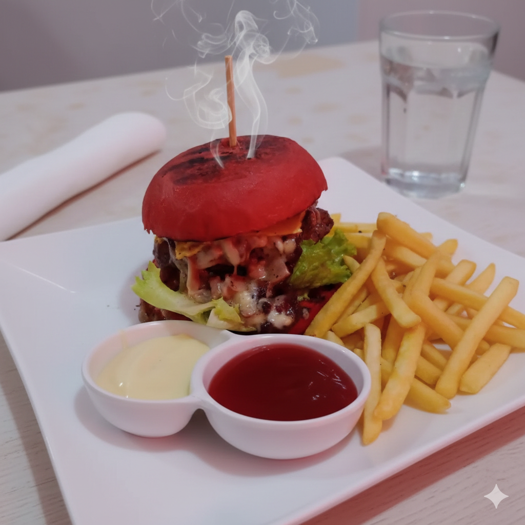 Con la receta francesa original del chef, pan artesanal de color rojo, lechuga, tomate, torta angus, cebolla caramelizada, queso amarillo, fondue de tocineta y hongos acompañado de papas.