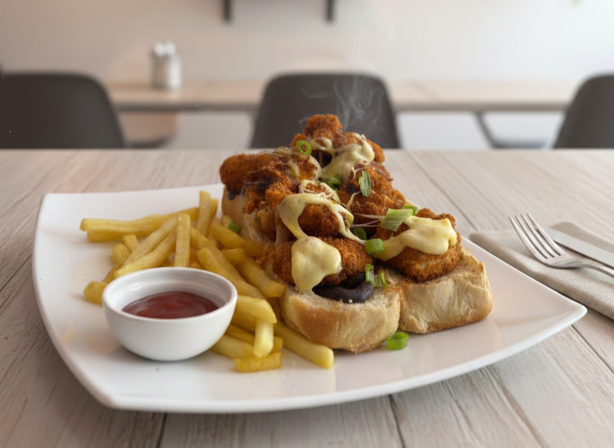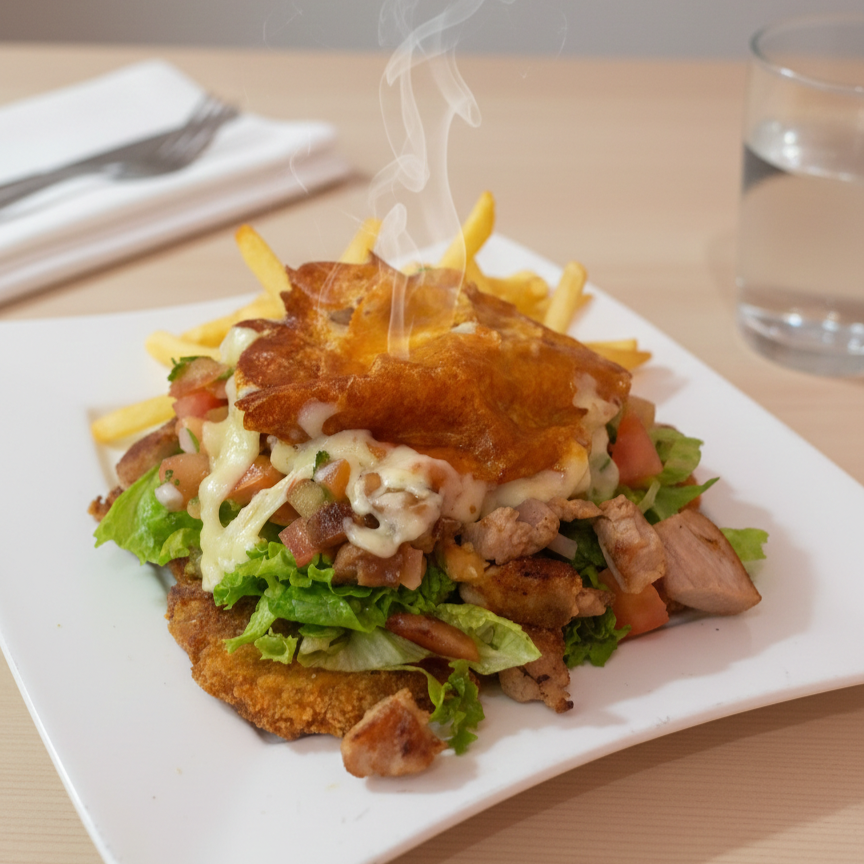 Pan artesanal grande, cubos de pollo empanizado, mozzarella derretido, frijoles molidos, salsa de queso Cheddar, mayonesa de la casa, acompañado de papas fritas.