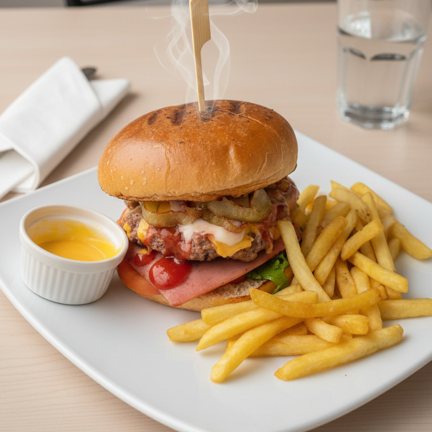 Pan artesanal de color blanco, 2 tortas angus, queso americano, jamón, tocineta, pepperoni, salsa BBQ, piña picada salteada y envuelta en queso mozzarella derretido, salsa de queso Cheddar, acompañada de papas.
