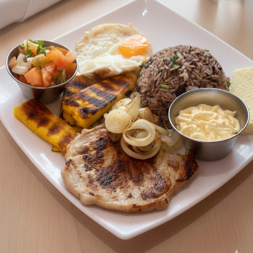 Arroz blanco, frijoles arreglados, proteína a escoger, plátano maduro, huevo frito, ensalada mixta .