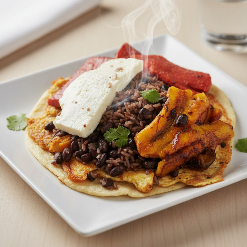 Pinto con la receta secreta de la casa, proteína a escoger, natilla, papas fritas, huevo frito, pico de gallo y queso.