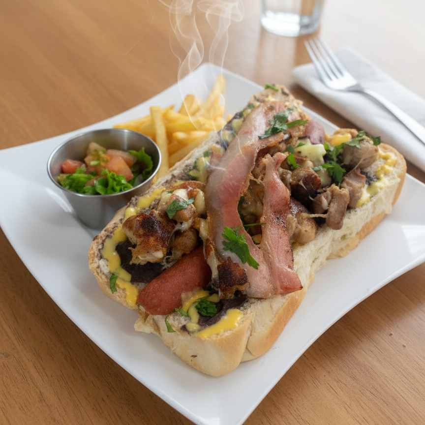 Pan artesanal grande, frijoles molidos, chicharrón de cerdo envuelto en queso mozzarella, salchicha envuelta en tocineta, salsa de queso Cheddar y pico de gallo, chips de maiz en el relleno acompañado de papas fritas.