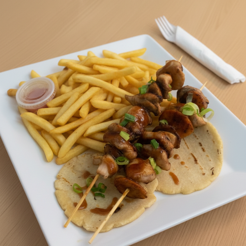 Dos brochetas de pollo o dos de cerdo con su salsa favorita, pueden ser también dos brochetas mixtas acompañado de papas y ensalada.