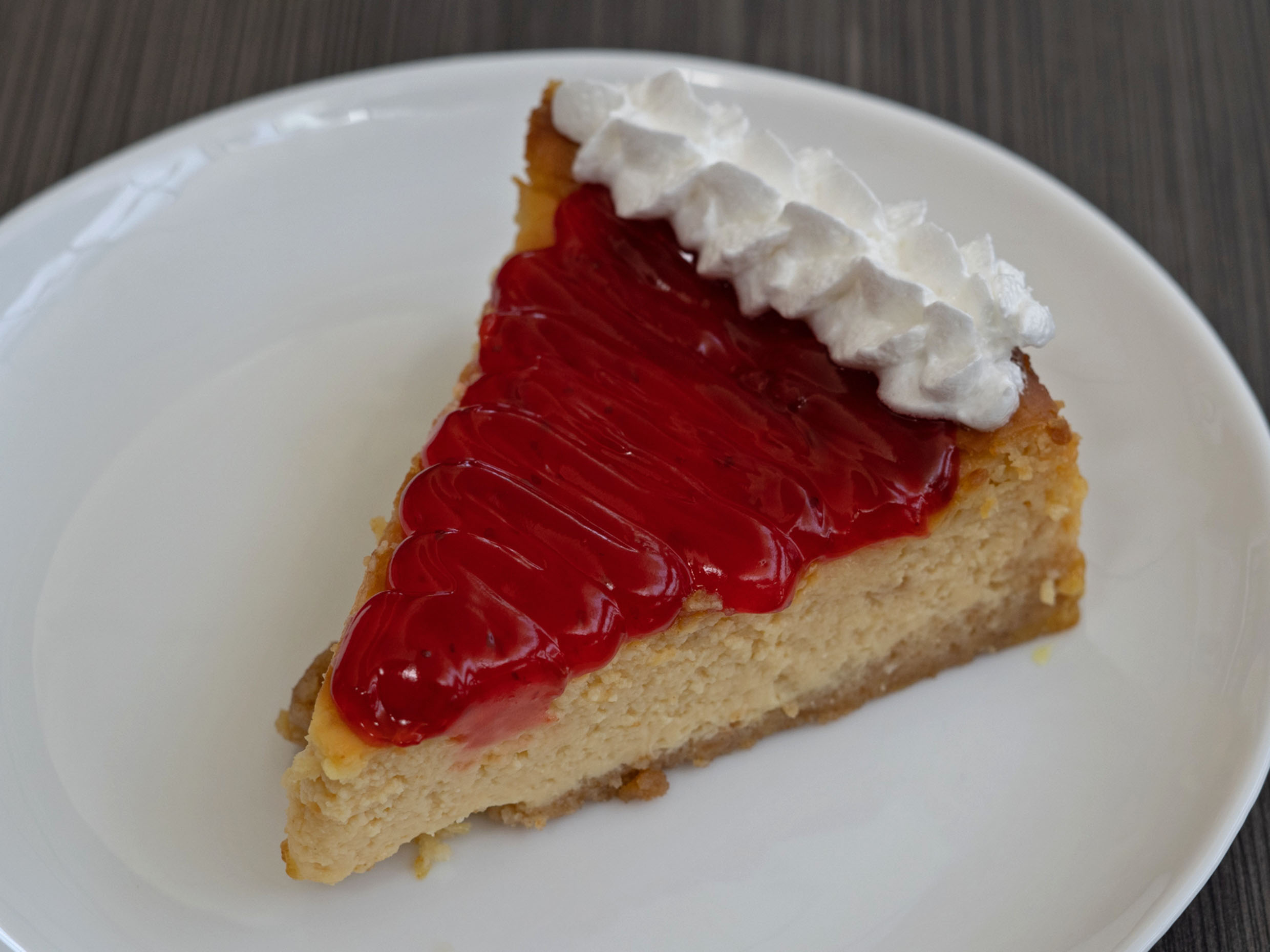 Suave y cremoso cheesecake artesanal horneado, con un baño de mermelada de fresas.