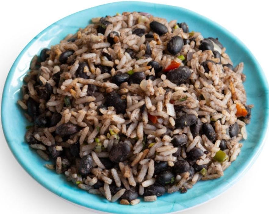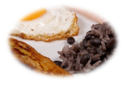 Gallo pinto, 2 huevos al gusto, queso turrialba, plátano maduro, natilla, tostadas y bebida