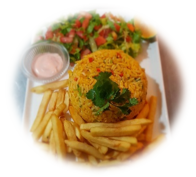 Arroz con mix de mariscos acompañado de papas a la francesa y ensalada
