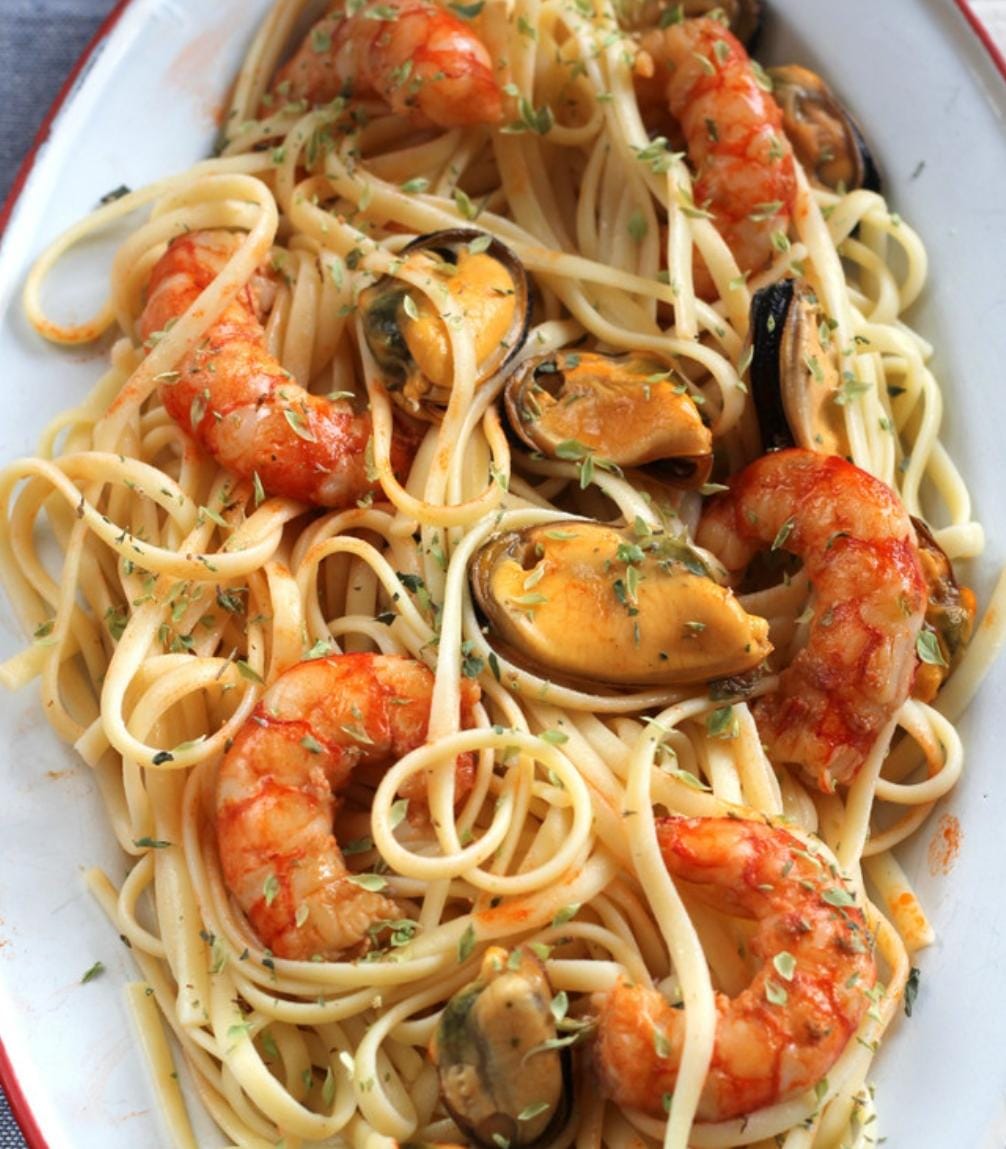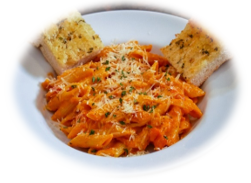 Pasta en Salsa de Aurora con Mezcla de Mariscos. Acompañada de Pan de Ajo