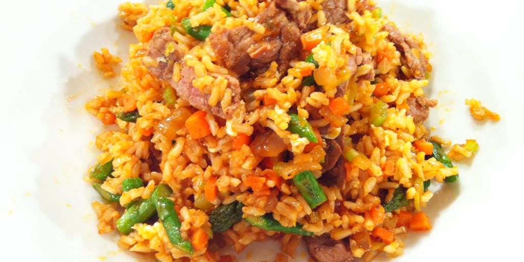 Arroz tico con pollo, camarón, cerdo acompañado de papas a la francesa y ensalada