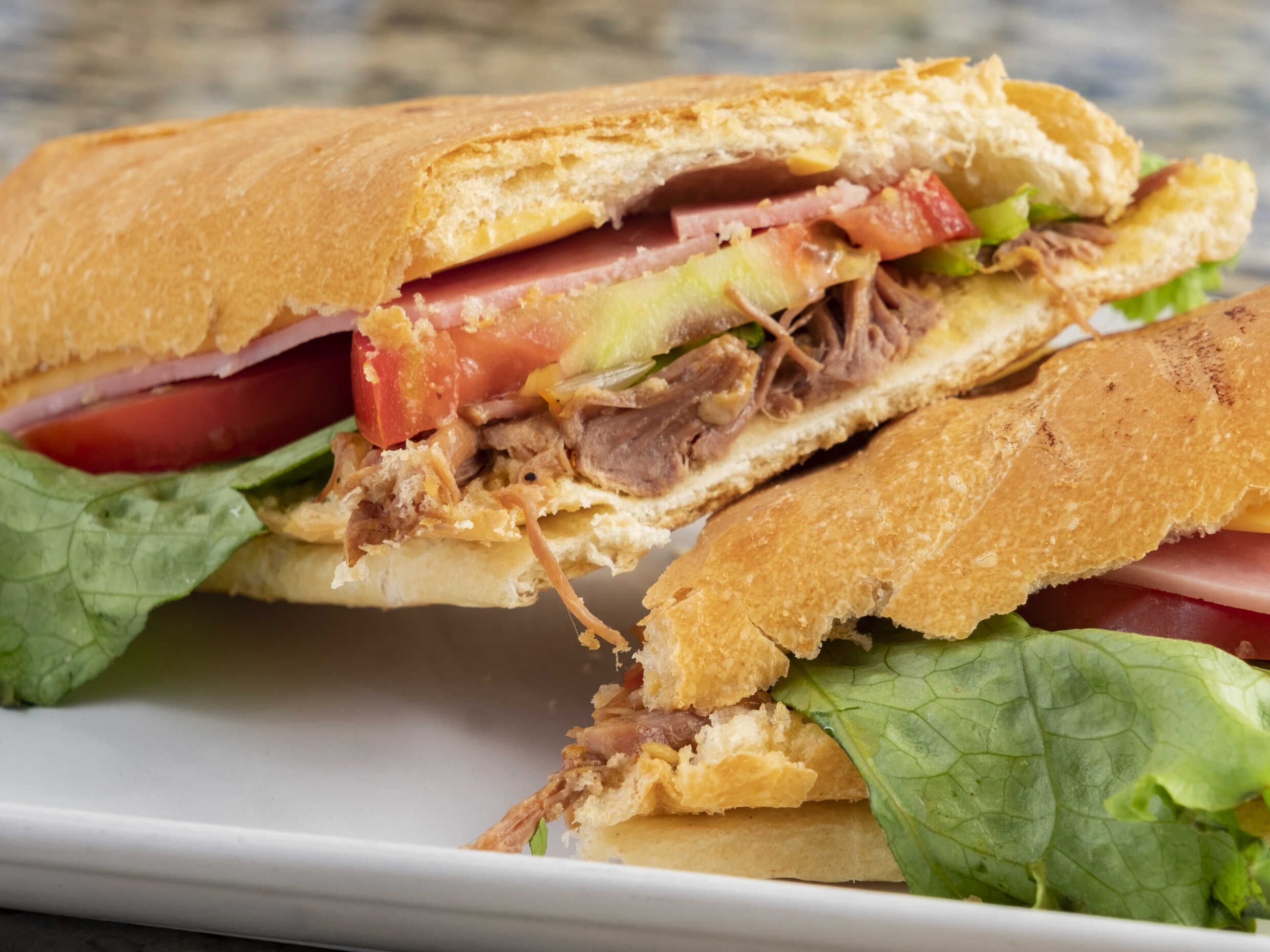 Torta de res, queso, tocineta, aguacate, lechuga, tomate, aderezo de la casa y papas a la francesa.