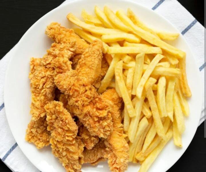 Dedos de Filet de pollo empanizado acompañados de papas fritas