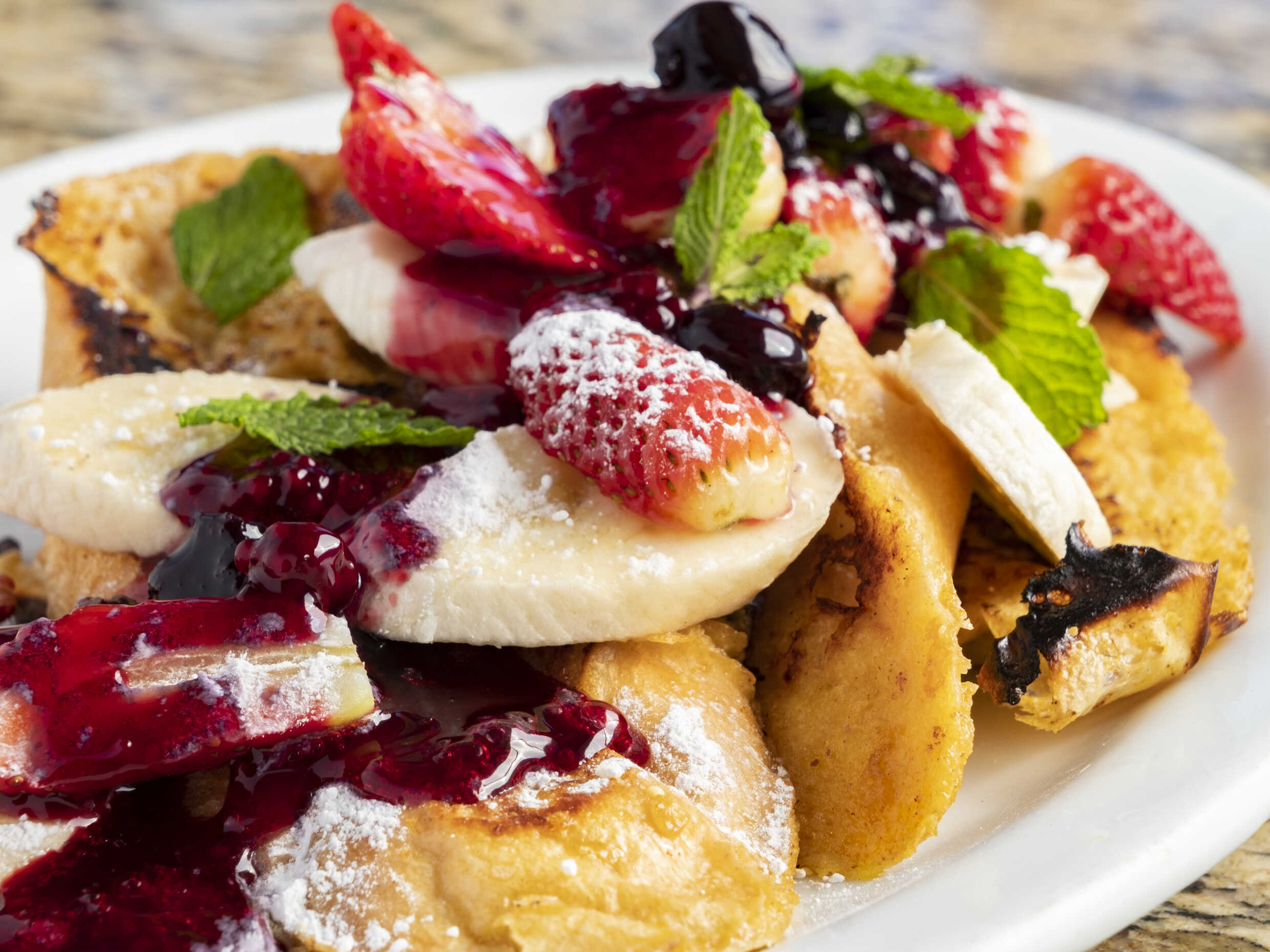 3 Tostadas perfectamente doradas y aromatizadas con canela y vainilla, Acompañada de Fruta fresca ( Banano y Fresa), cubiertas con una salsa artesanal de frutos rojos.