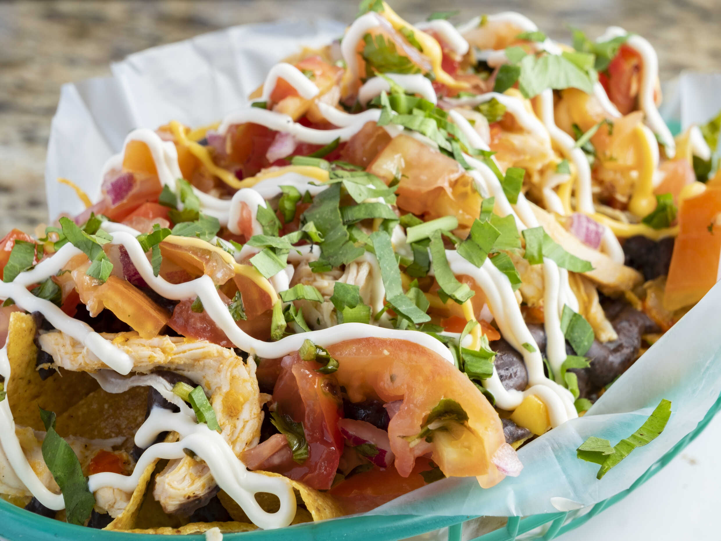 Tortillas tostadas, Frijoles Molidos, Pollo Arreglado, Chimichurri, Queso Cheddar y Natilla.