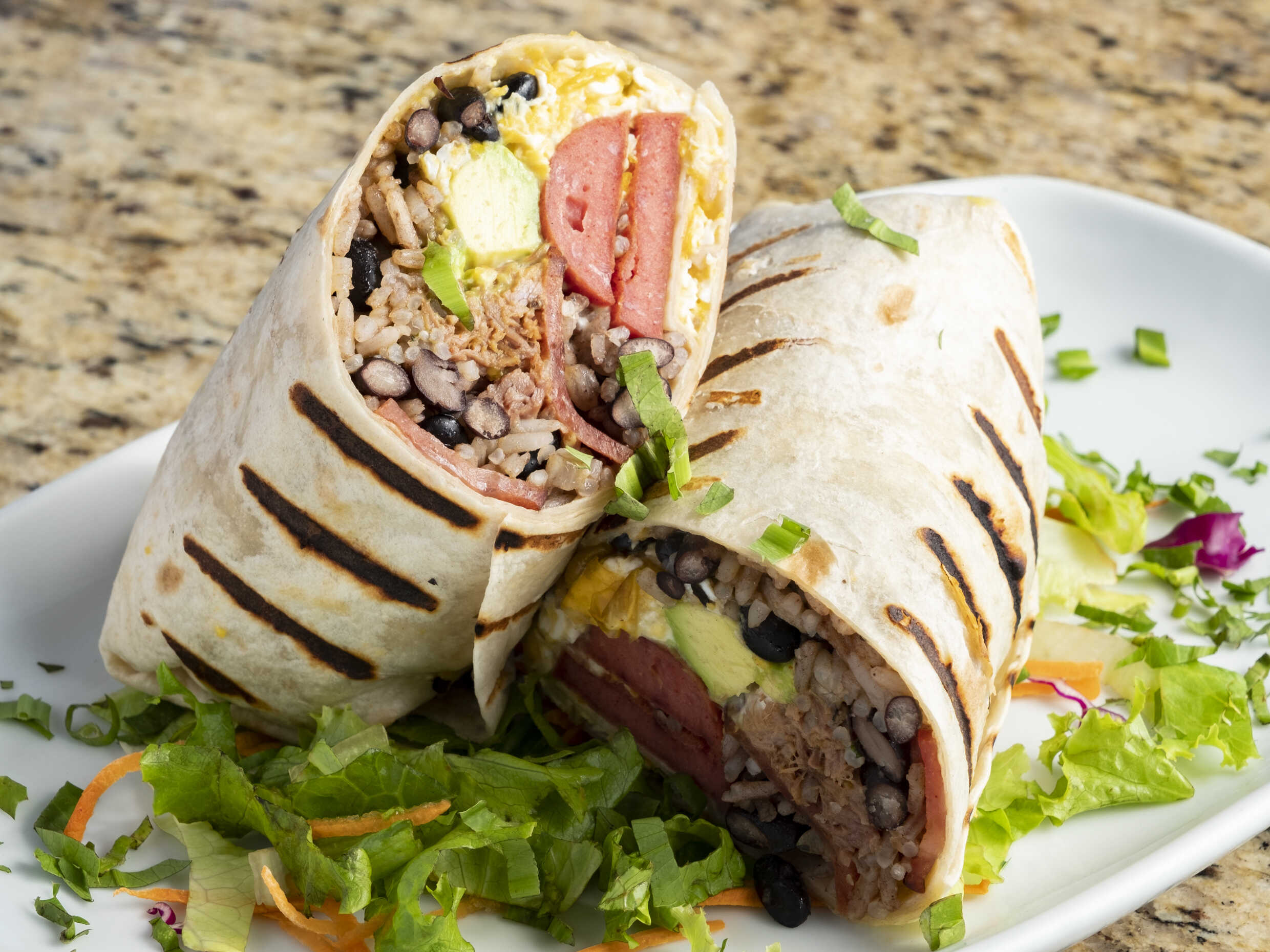 Gigantesca tortilla de harina, rellena con gallo pinto, torta de huevo, jamón, Pico de gallo y plátano maduro.