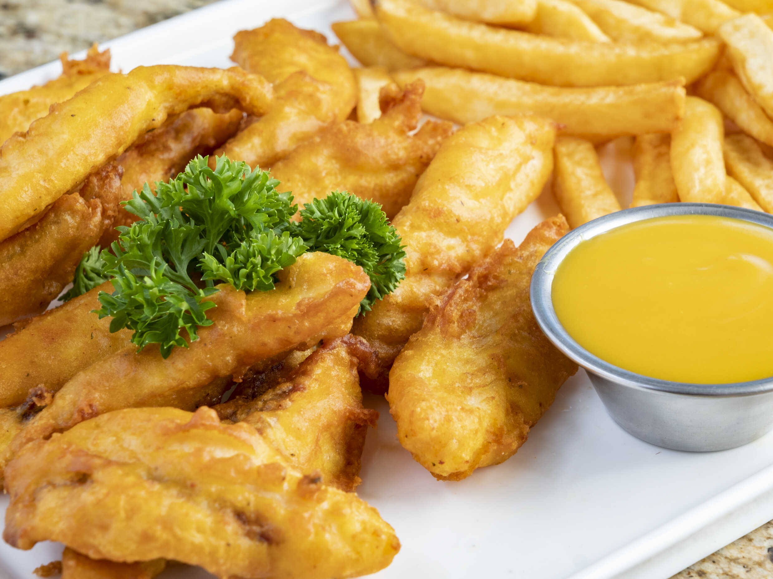 Dedos de filet de pescado empanizados acompañados con papas fritas