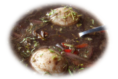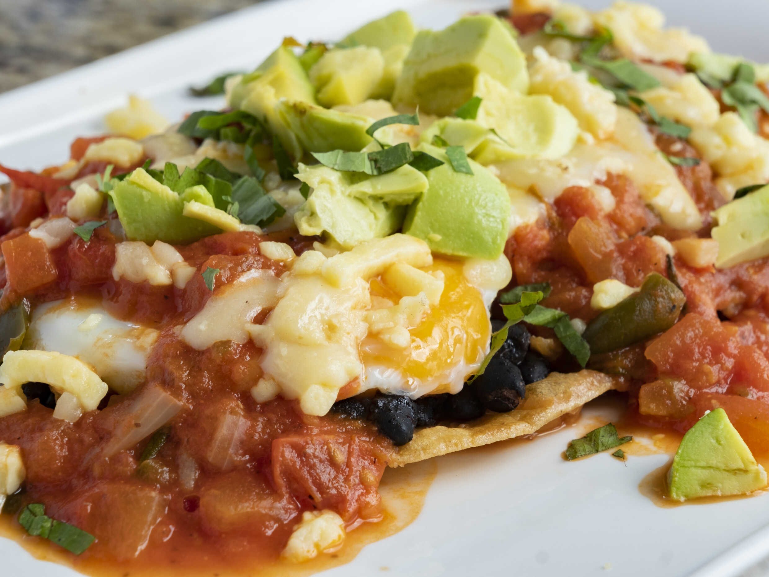 2 Huevos fritos sobre 2 tortillas de maiz, Frijoles negros, bañados en salsa de tomate de la casa, acompañados de aguacate fresco y culantro.