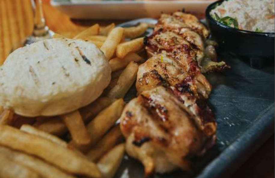 Chuzo de carne de res y pollo, acompañada de papas al gusto y ensalada al gusto.