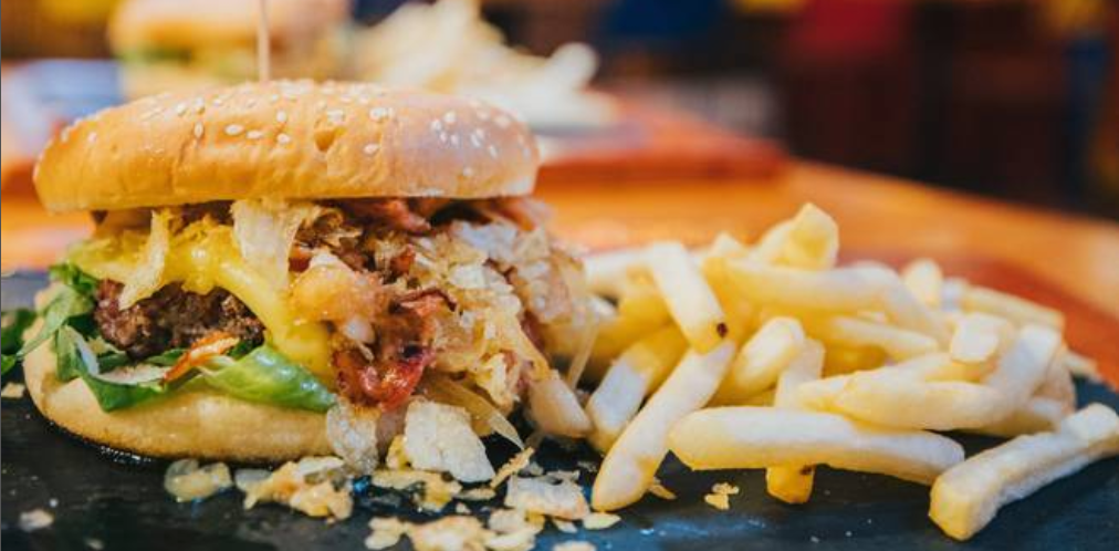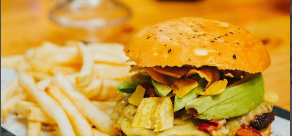 1/4 lb de Torta de carne, lechuga, queso mozzarella, tocino, guacamole, cebolla morada, papas tostadas.