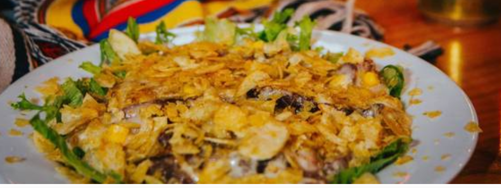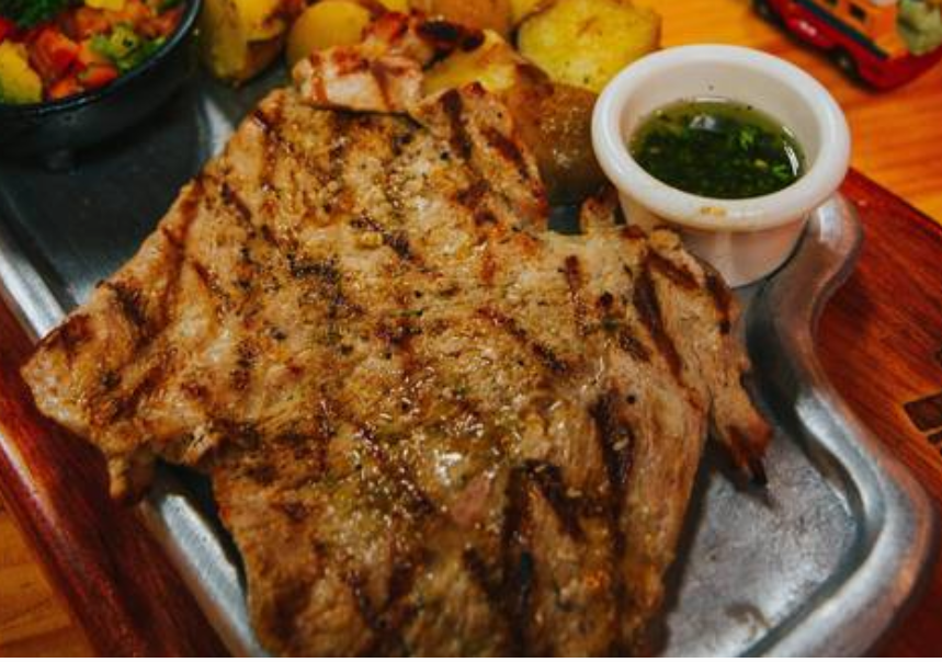 Cerdo acompañado con lechuga, maíz dulce, tocino, salsa tártara, queso mozzarella y papas tostadas.
